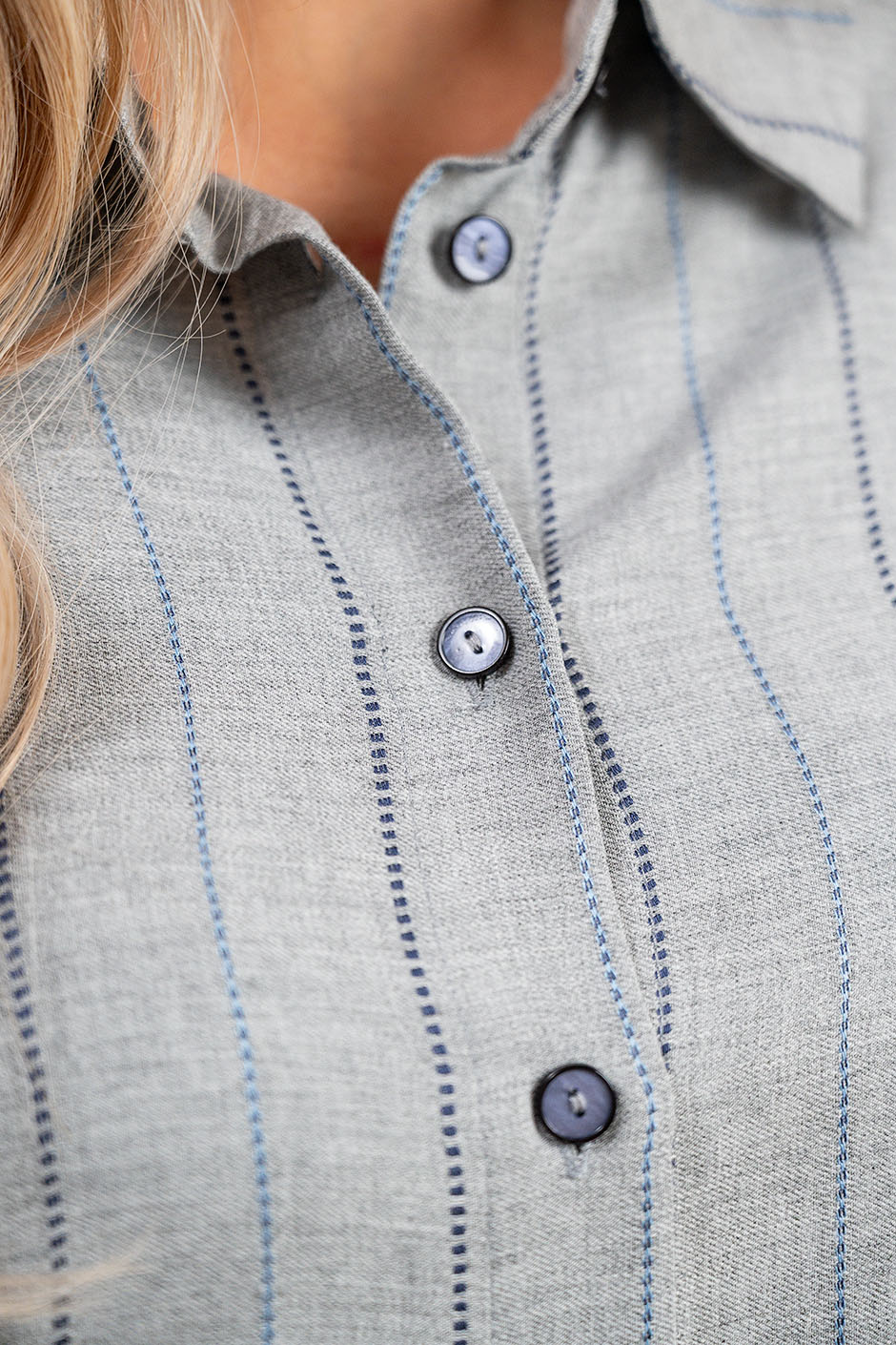 Ткань: вискоза. Рубашка прямого покроя, рукав втачной, воротник на стойке, спереди застежка. Рукав длинный с манжетом на одну пуговицу с декоративным отворотом. Длина изд. ок.65 см