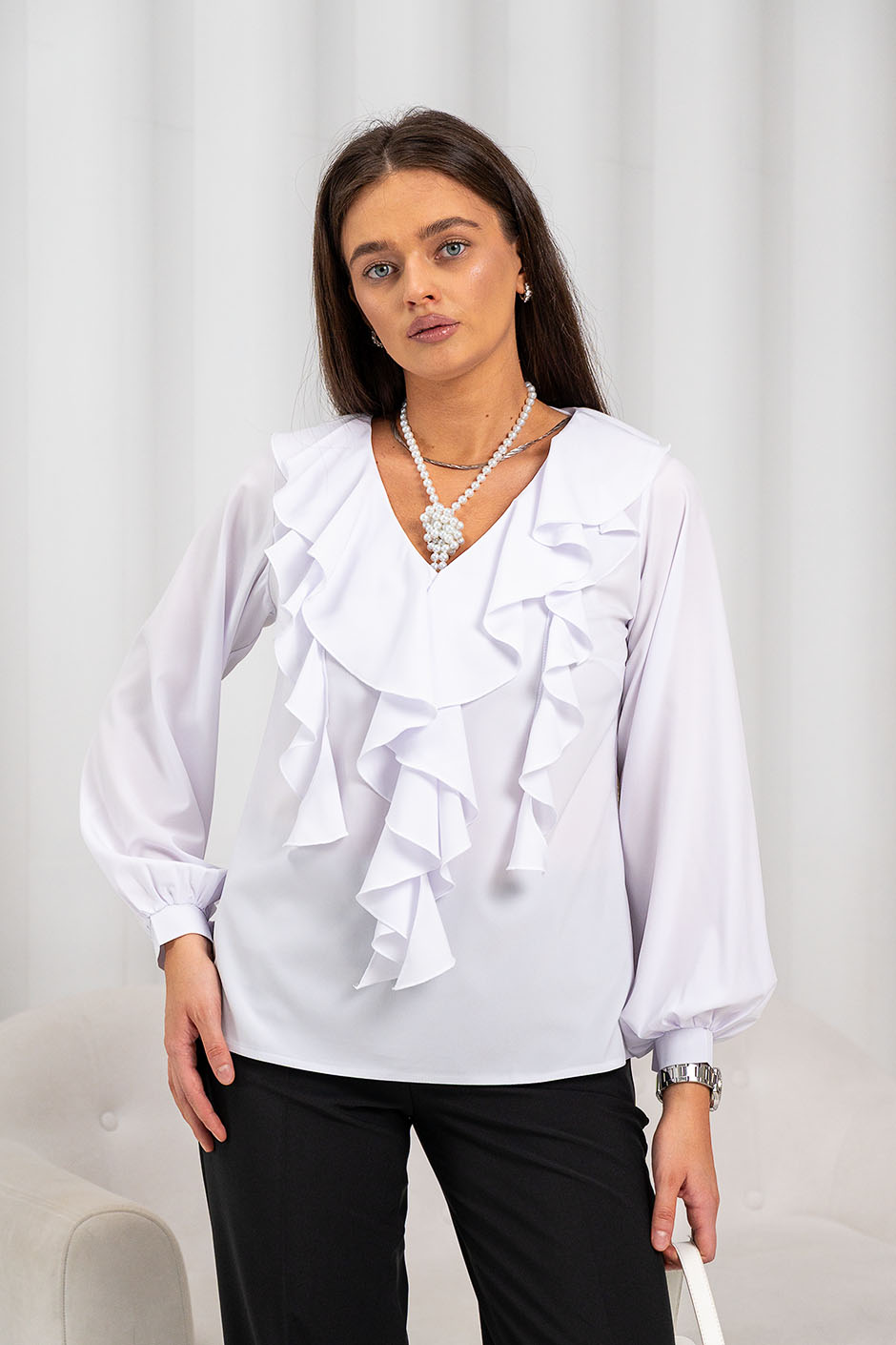 Ткань: искусственный шелк. Блузка простого покроя, с V-образным вырезом, по вырезу рюша, Рукав длинный на манжете. Длина изд. ок.65см.