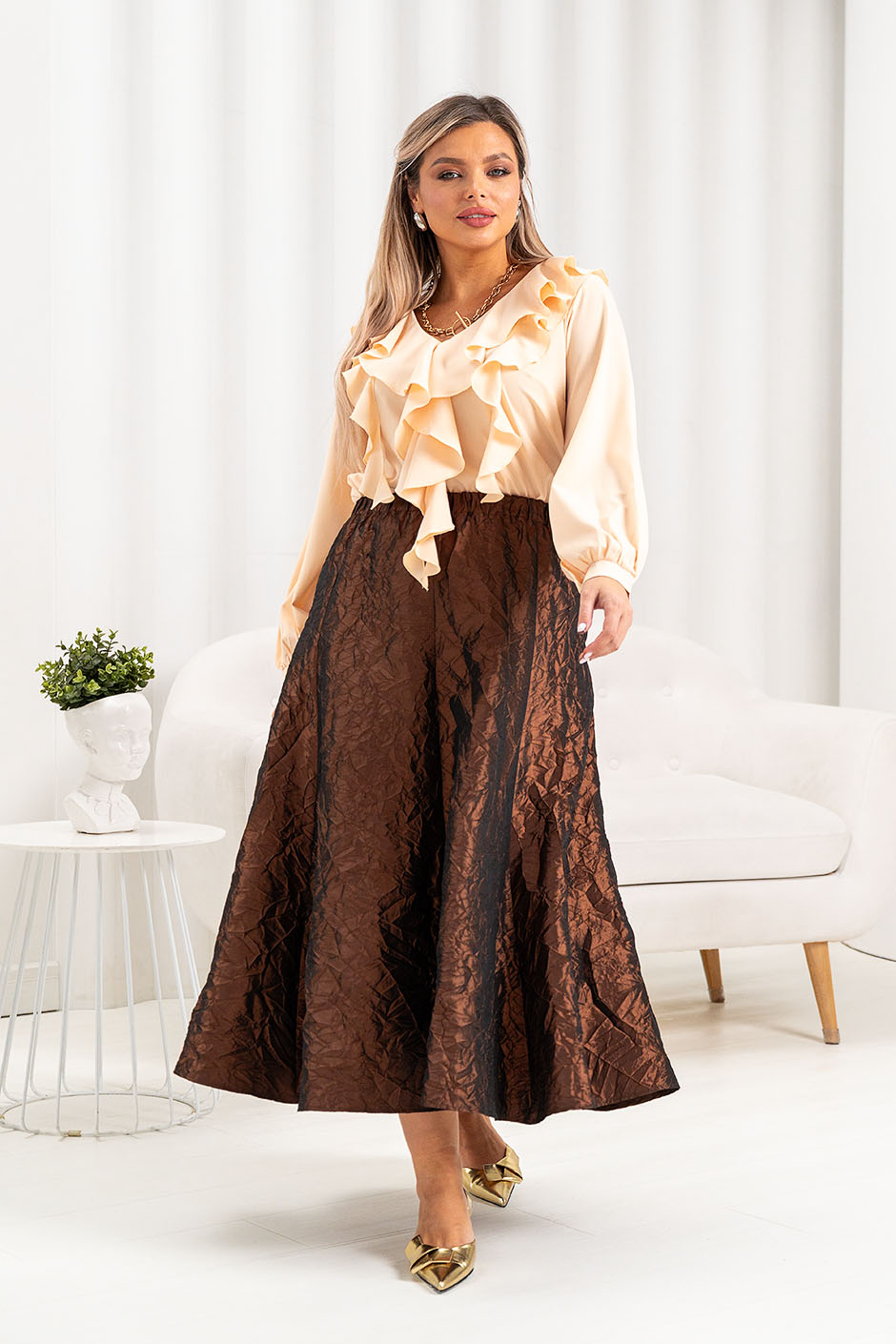 Ткань: искусственный шелк. Блузка простого покроя, с V-образным вырезом, по вырезу рюша, Рукав длинный на манжете. Длина изд. ок.65см.