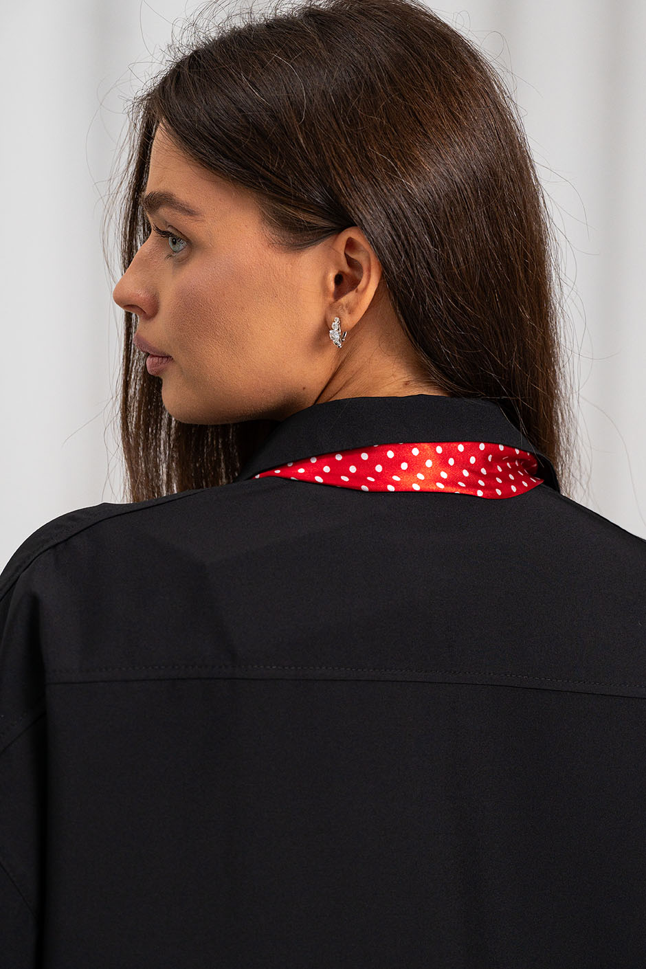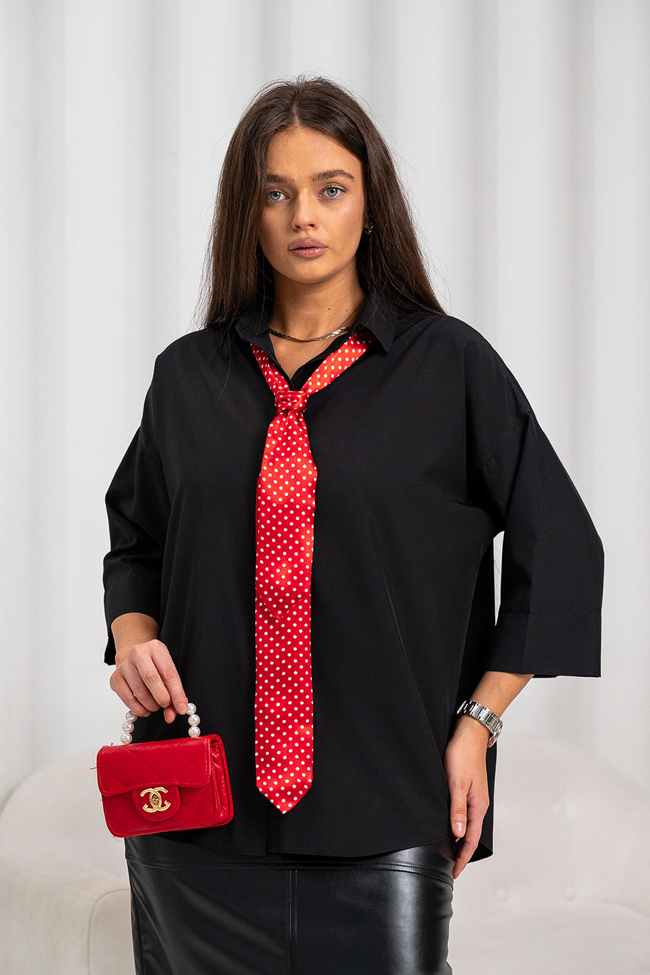Ткань: блузочная.  Рубашка свободного покроя, спереди застежка на пуговицы, воротник на стойке, рукав цельнокроеный. Рукав длиной ¾. К рубашке прилагается галстук в горошек.Длина ок.72 см.