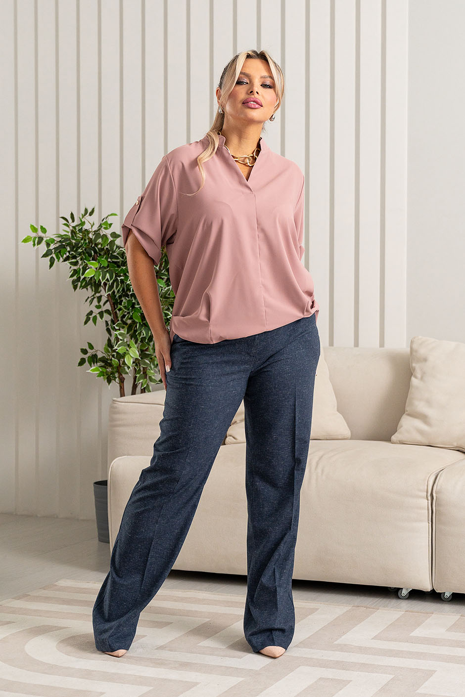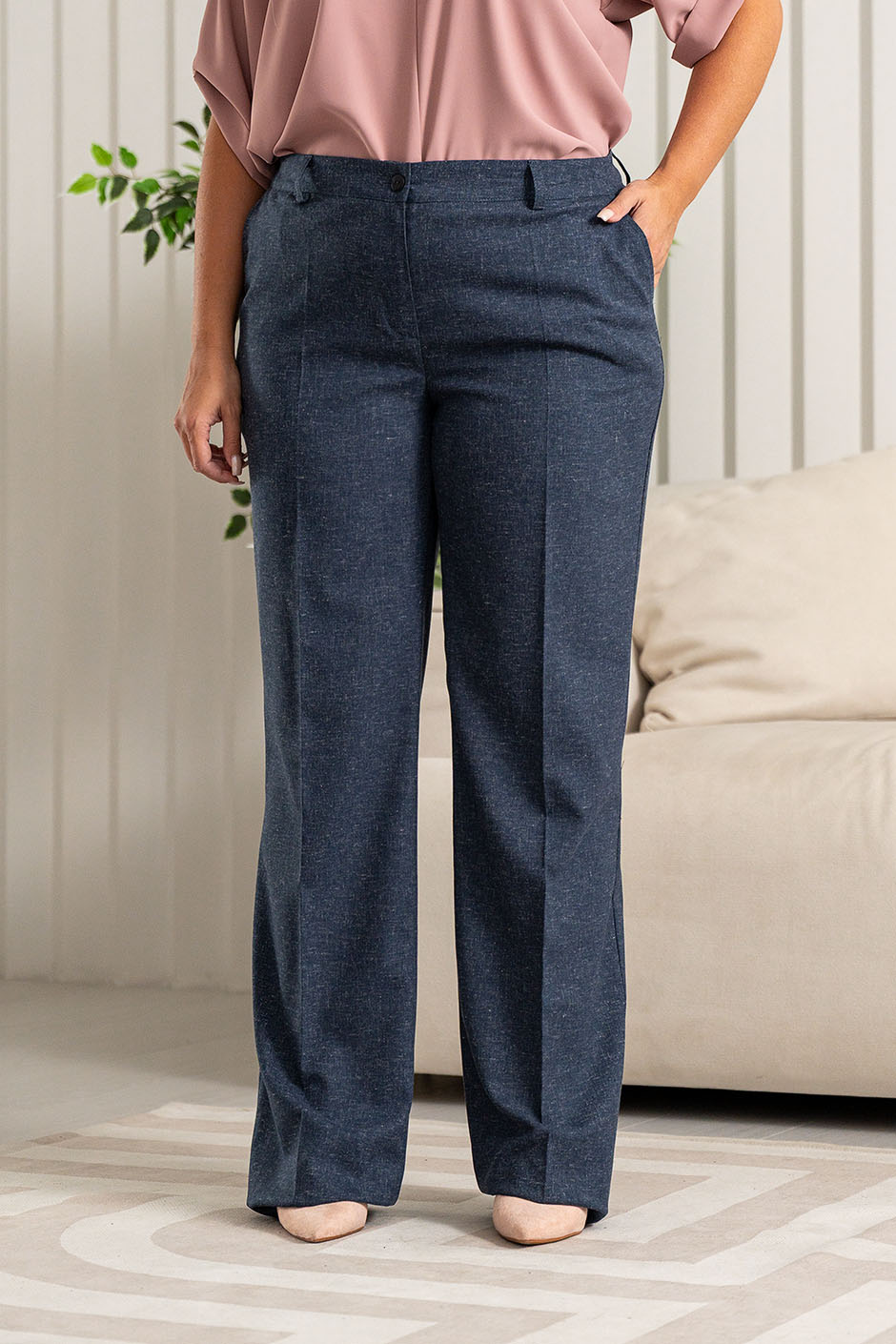 Ткань: костюмная однотонная. Брюки прямые, широкие,с высокой посадкой, спереди застежка на молнию, в боковых швах косые карманы, на поясе шлефки под ремень. Длина по внутреннему шву ок.86 см.