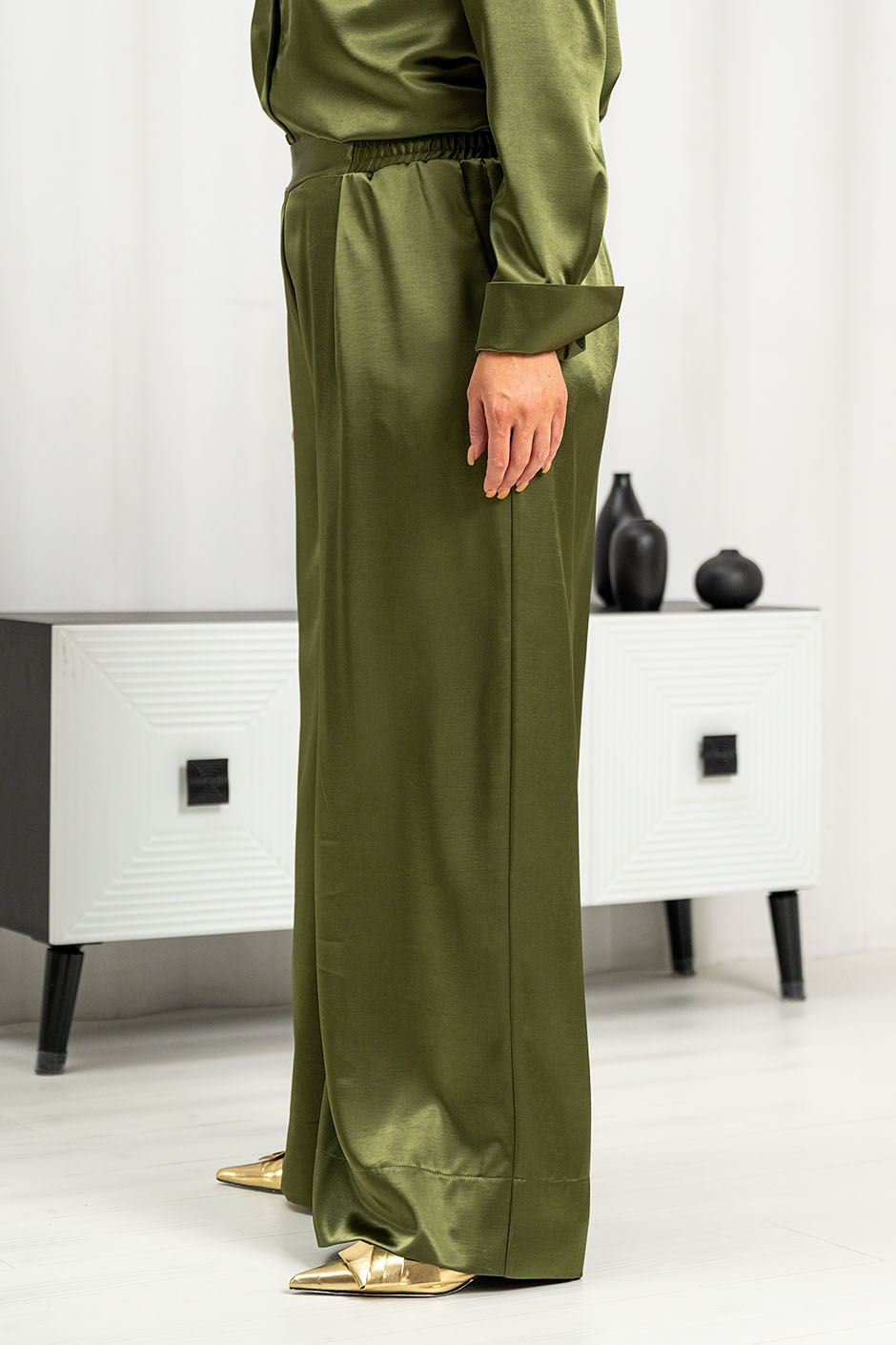 Ткань: шелк-сатин. Брюки с высокой посадкой, спереди пояс кокетка, и заложенная складка, сзади на резине, в боковых швах косые карманы. По низу изделия высокая подгибка. Ширина брючины  38см. Длина изд. по внутреннему шву ок.78см.