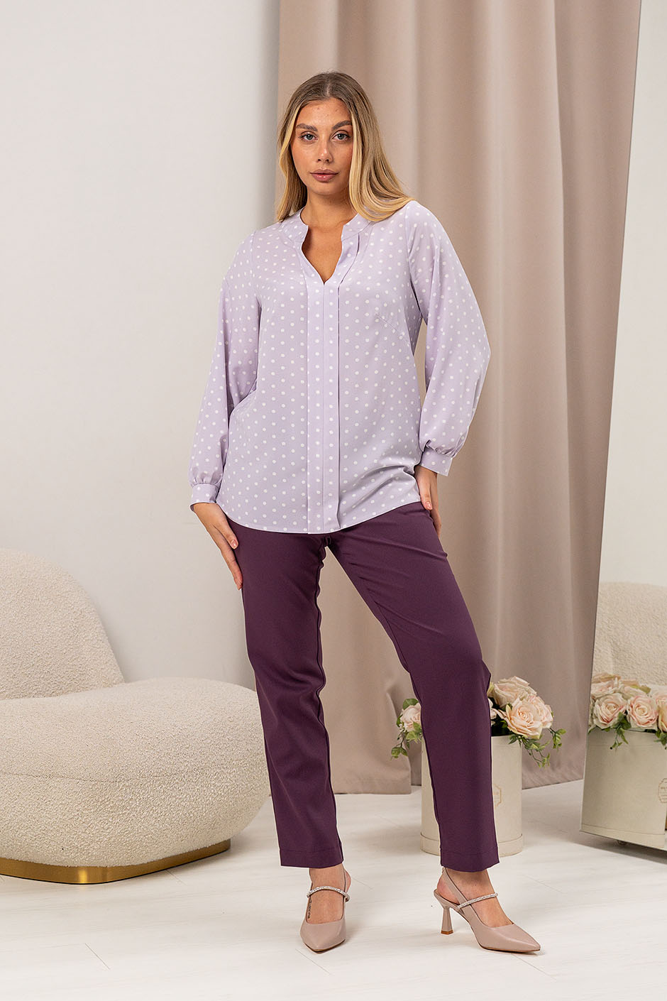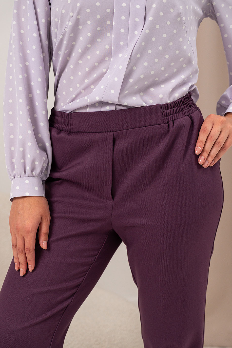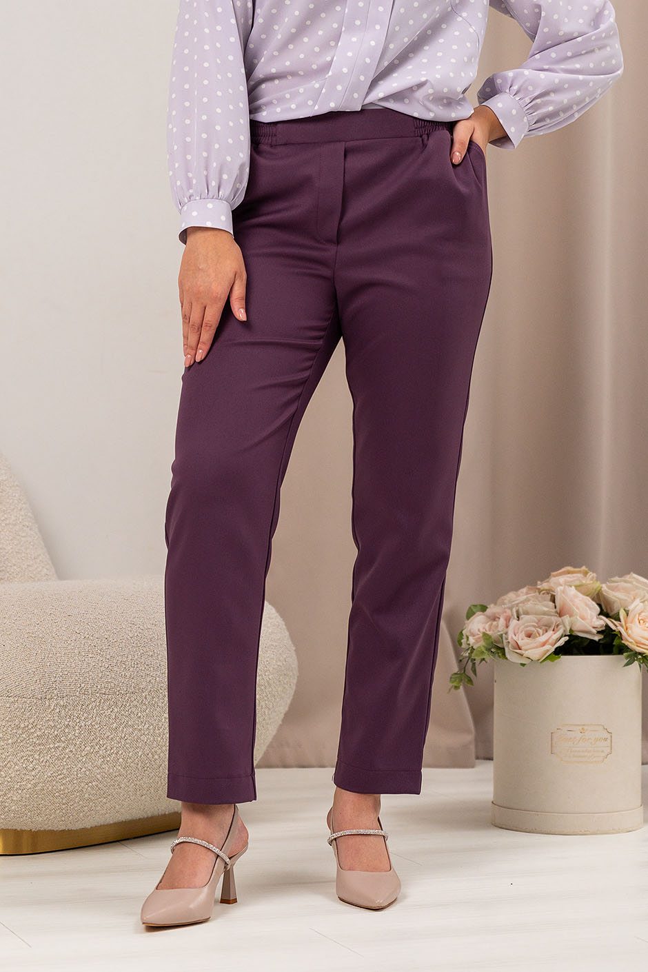 Ткань: костюмная однотонная.Брюки с высокой посадкой, спереди – пояс кокетка, сзади на резине, в боковых швах – косые карманы. Длина по внутреннему шву ок. 72 см.