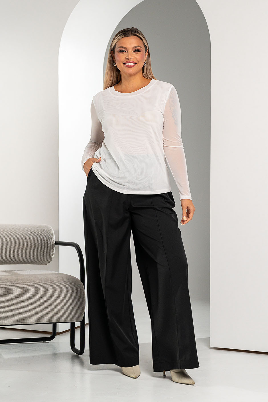 Ткань: сетка . Лонгслив полуприлегающего покроя, с небольшим вырезом. Перед лонгслива двойной.Рукав длинный. Длина ок.64см.